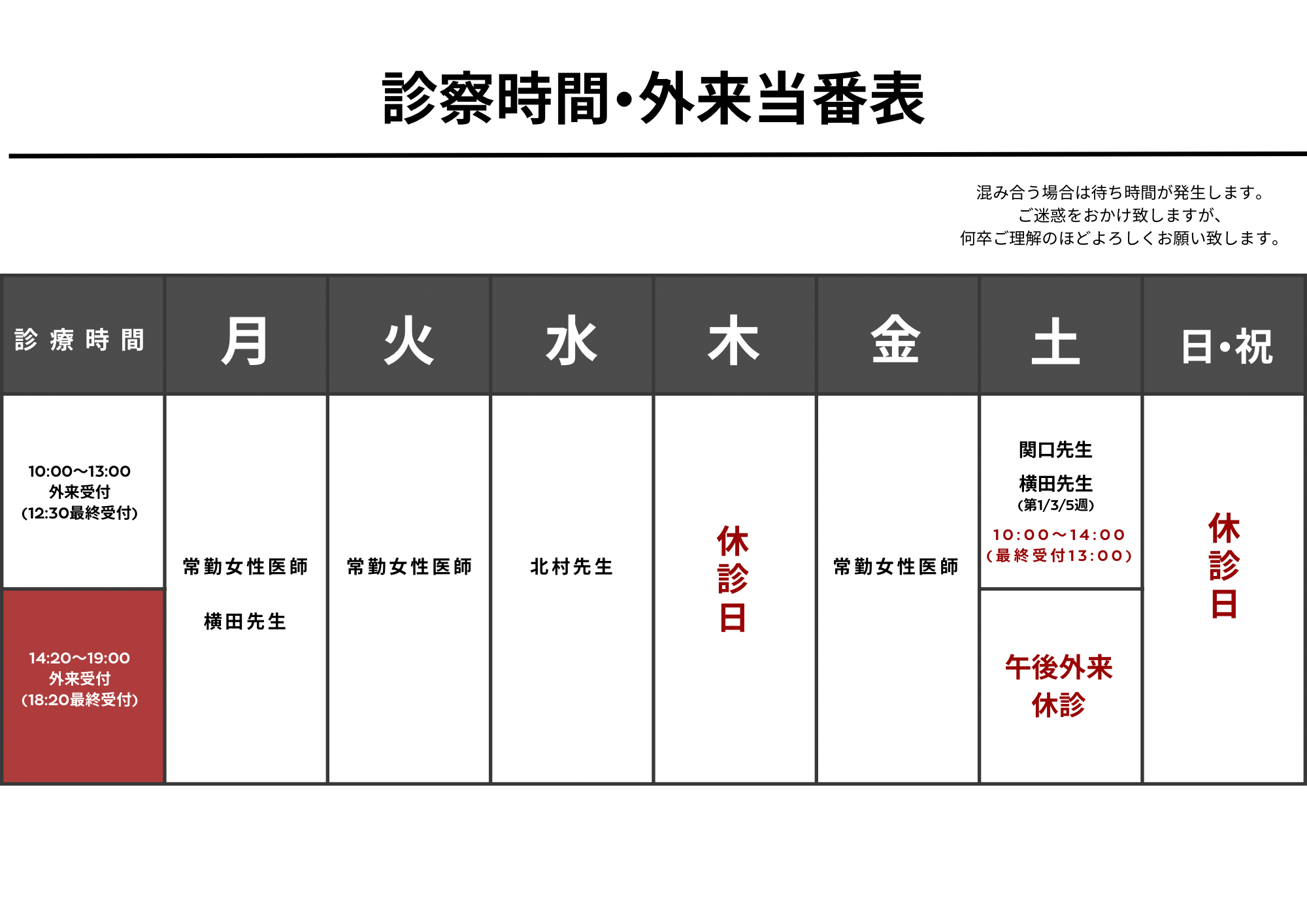 | 14:20〜19:00 午後外来 (18:20最終受付) | ◯ | ◯ | ◯ | ― | ◯ | ― | ― |