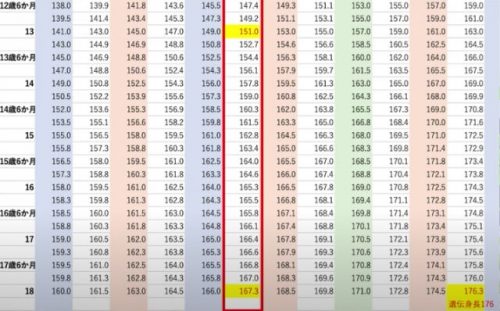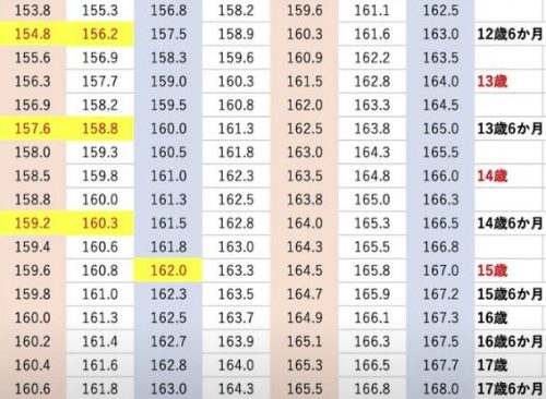 男子の場合18歳で完成、女子の場合今回使用した表だと17歳6ヶ月と書いていますが、何か努力をして身長が伸びる時期というのは男子よりも更に早く、14歳の時点で最終身長が決まります。
